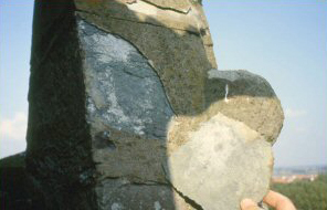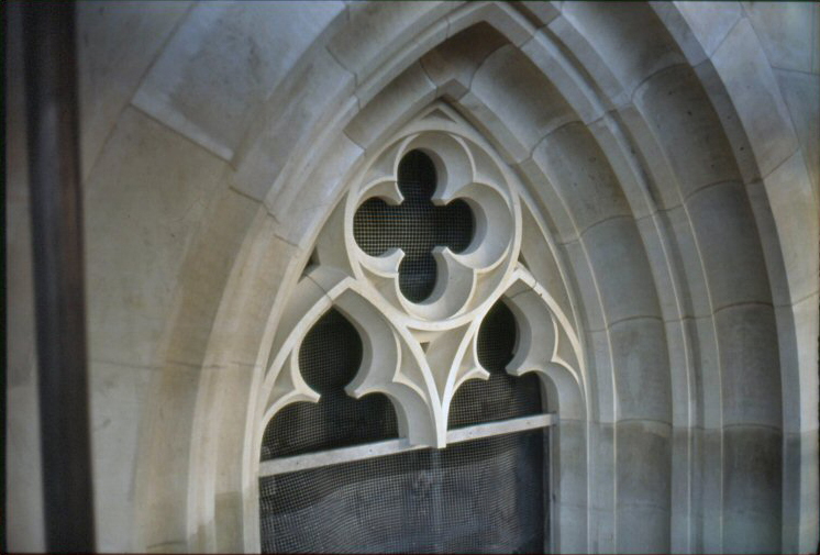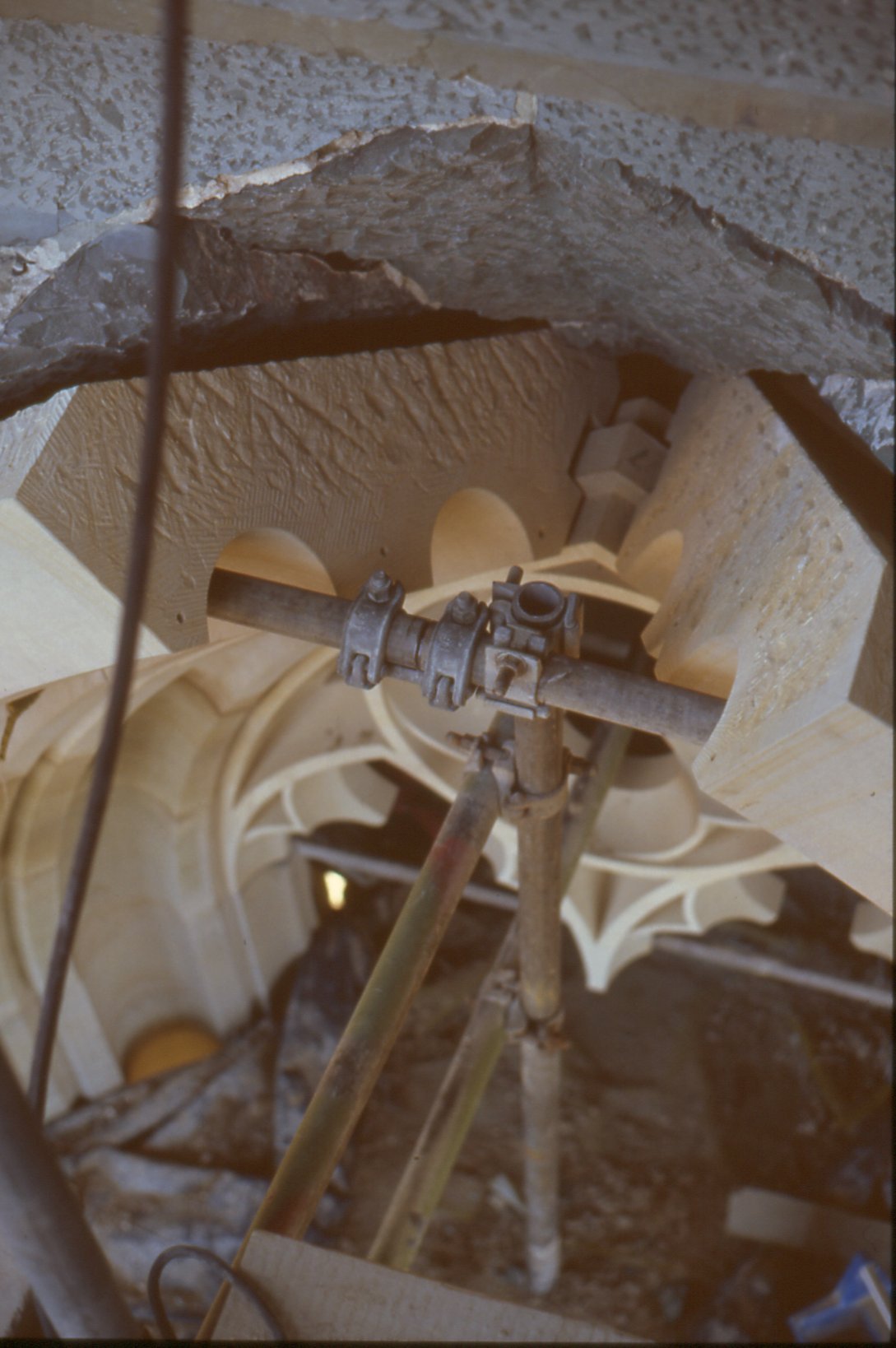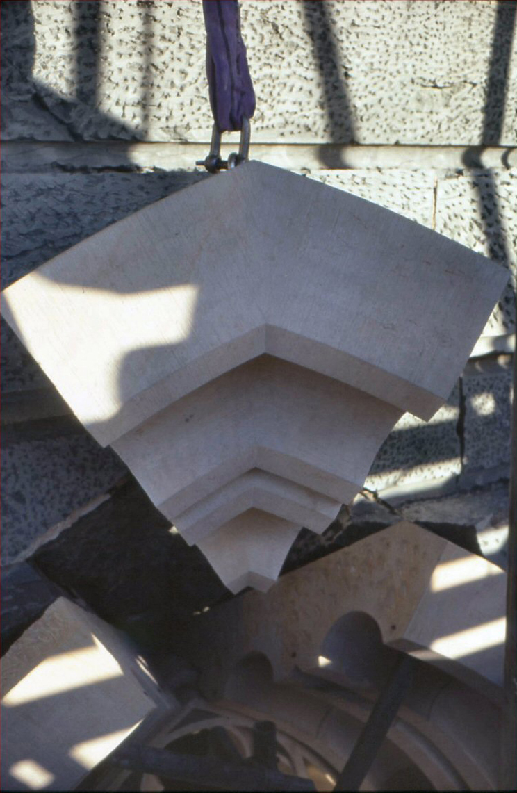 Blick auf eine Wimpergecke der 1. Zone, welche die Ausbildung der ca. 18 m hohen und über 70 t schweren, frei stehenden Riesenfialen aus der Turmecke markiert. Der originale grüne Stein ist zerstört und die wertvolle gotische Zier ist abhanden gekommen. Das geschah einerseits durch den sogenannten Zahn der Zeit, also durch Verwitterungen, aber ebenso durch Verlust wichtiger Festigkeitseigenschaften im Steinmaterial. Andererseits wurde der Verlust wertvollster Substanz im Laufe der Geschichte einmal auch von Menschenhand herbeigeführt.