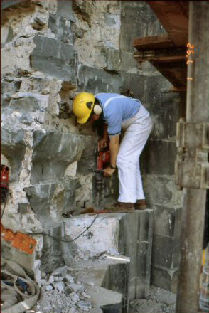 Eine besondere Schwierigkeit an den Türmen stellte der Steinabbau dar. Hierfür wurde ab 1993 eine neue Verfahrenstechnik entwickelt, bis hin zum Einsatz von Diamantseilsägen. Theoretische Grundlage dafür ist das exakte Einmessen von Richtungen anhand der Turmgeometrie. Die Art der Anfertigung von Werksteinen geschieht in einer Mischung von industrieller Technik und von handwerklicher Technik, bzw. Technologie, jeweils auch in reiner Form. In der Bauhütte selbst werden neben der aufwändigen manuellen Anfertigung von Laubwerkarbeiten (Krabben, Kreuzblumen etc.) auch kompliziertere Profilarbeiten durchgeführt. Nachfolgend vier Abbildungen vom Versetzen eines in Obernkirchener Sandstein wiederhergestellten Maßwerkes und seiner gebogenen Laibung bis zum eingepassten Schluss-Stein, in Verzahnung Schicht um Schicht mit der verbliebenen Originalsubstanz aus Grünsandstein: