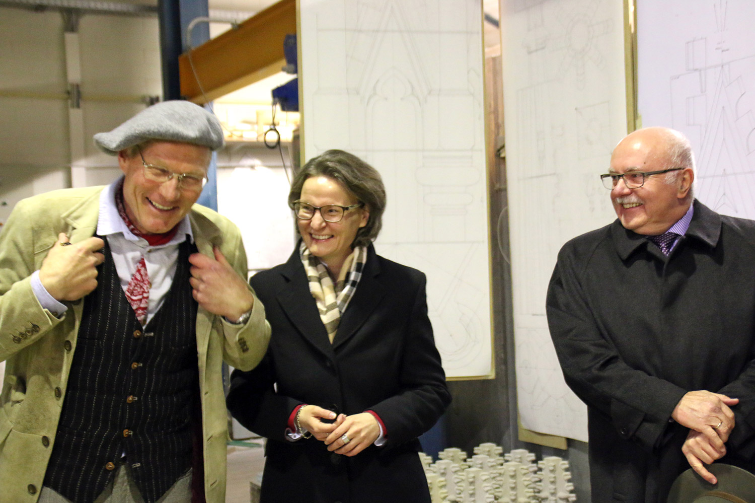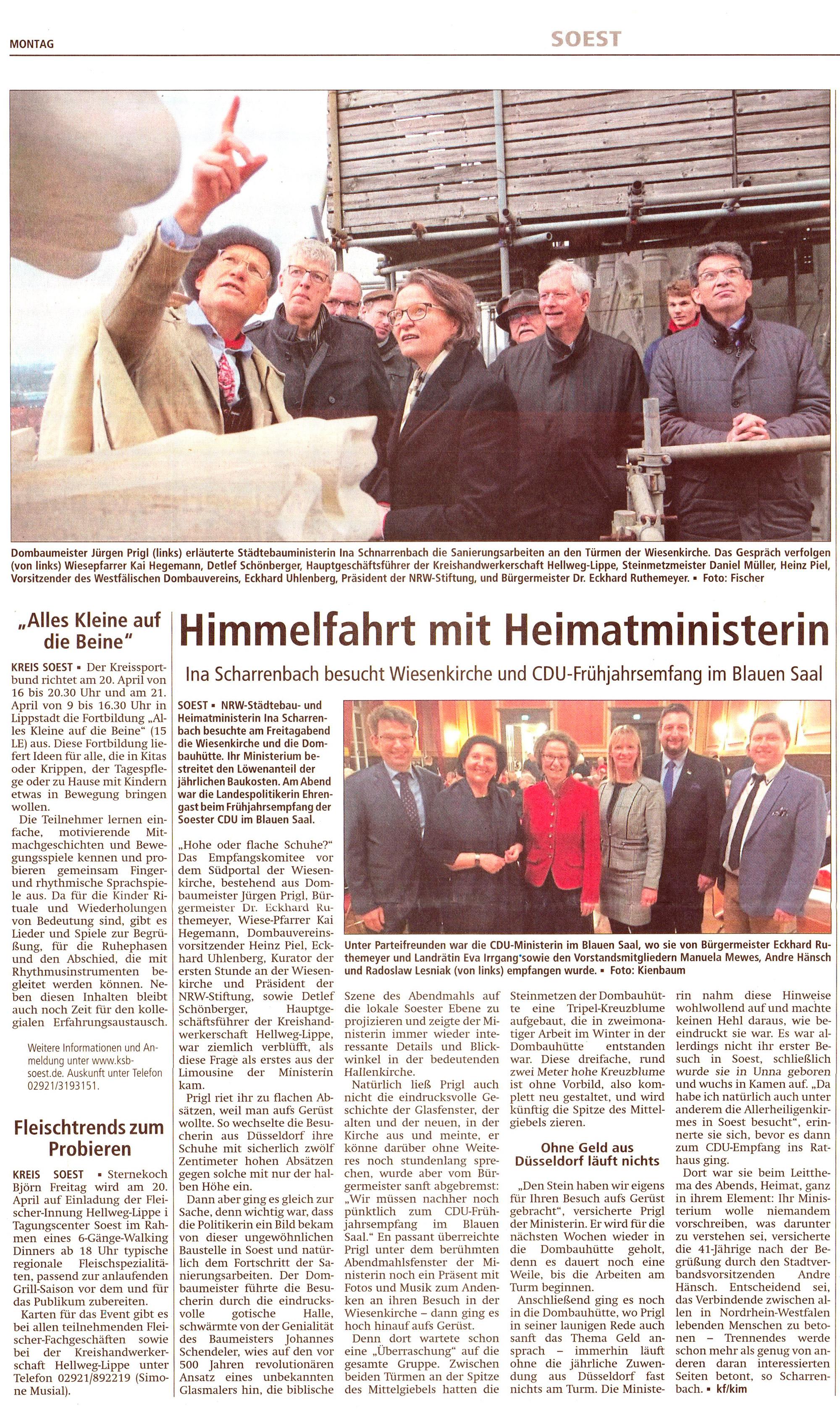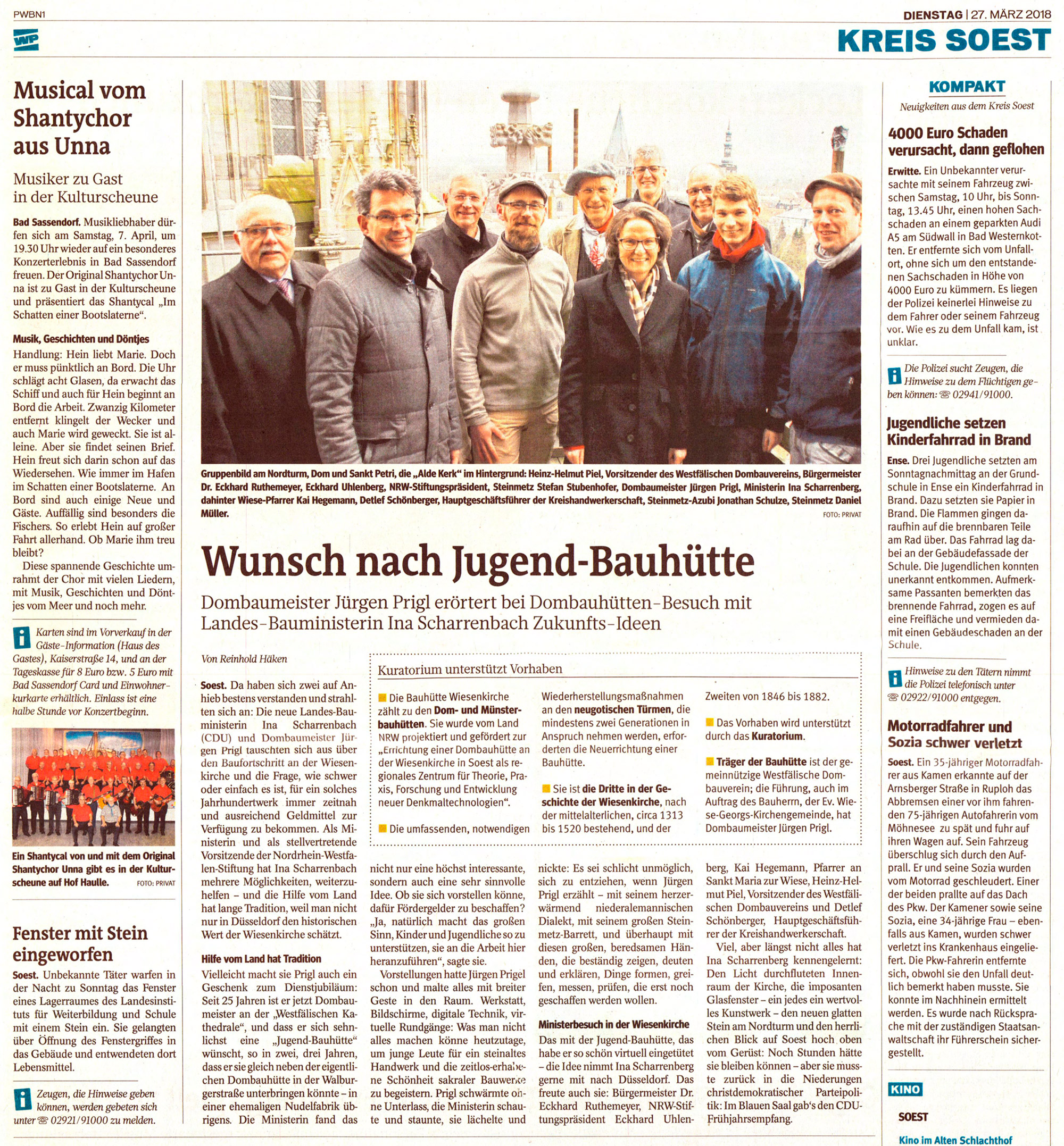 Am Freitag, den 23. März 2018 durften wir unserer Ministerin Ina Scharrenbach die generationsübergreifende Maßnahme an der Wiesenkirche und in allen Aspekten die Arbeit der Dombauhütte vorstellen und erläutern. Rasch konnte wahrgenommen werden, dass Frau Scharrenbach auch in Details fein informiert war. So gestaltete sich im Ablauf der mehr als 2 Stunden aus, dass zu den Gesichtern einer Dombauhütte auch ein übergeordnet Wesentliches gehört, welches die Zusammengehörigkeit aller Werkschaffenden über die Epochen der Jahrhunderte betrifft. Sowas ergibt sich von selbst, oder nicht, und kann dann gegriffen werden. Die Teilnehmer des Besuchskreises genossen die Atmosphäre. Die aufgeführten Bilder geben weitere Informationen, ebenso 2 Zeitungsartikel; der in einem Artikel benutzte Begriff Jugendbauhütte wurde während des Termins nicht verwendet, es war stets die Rede von einer „Kinderbauhütte“. Die Bilder sind von Thomas Brüggestraße und Klaus Fischer.
