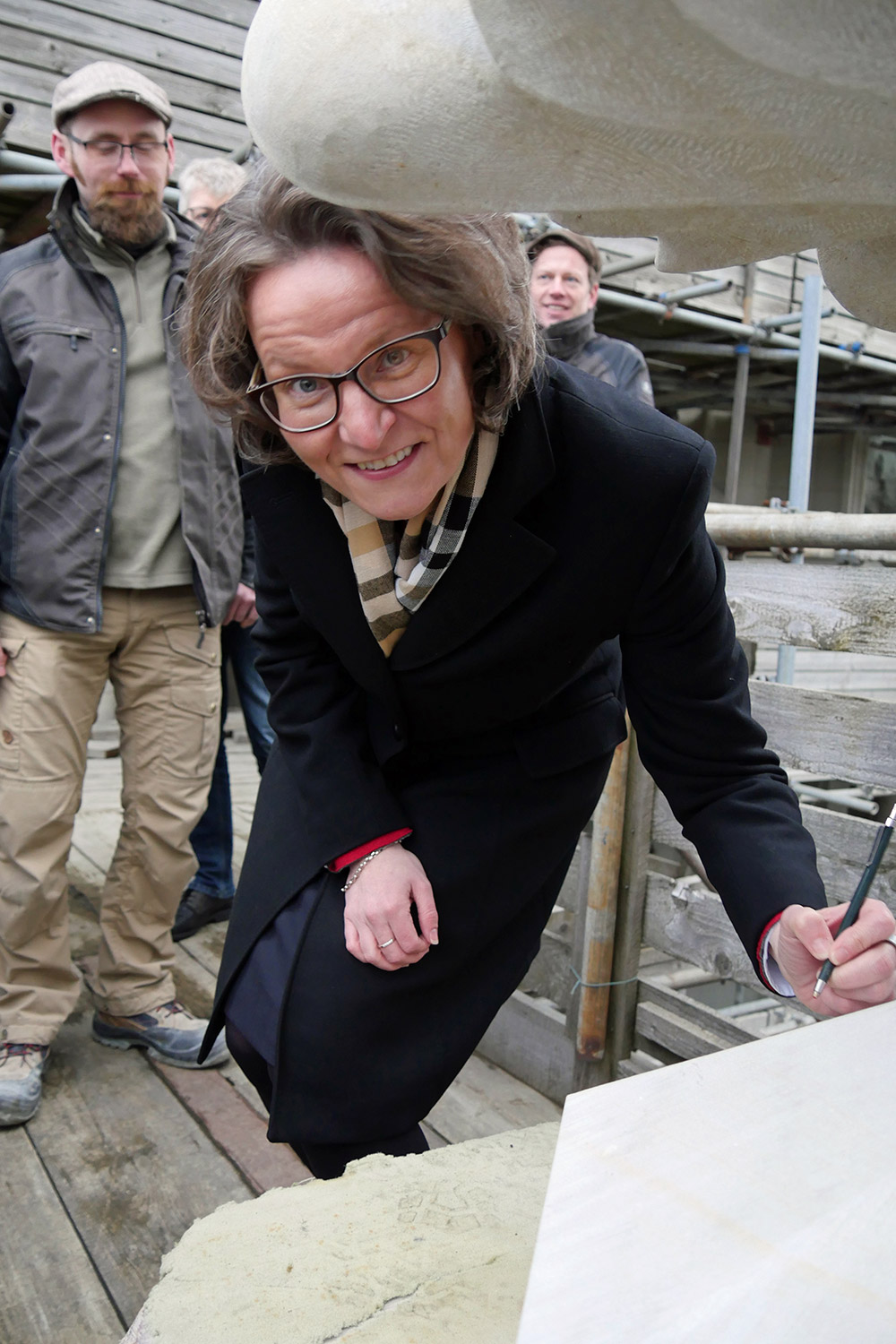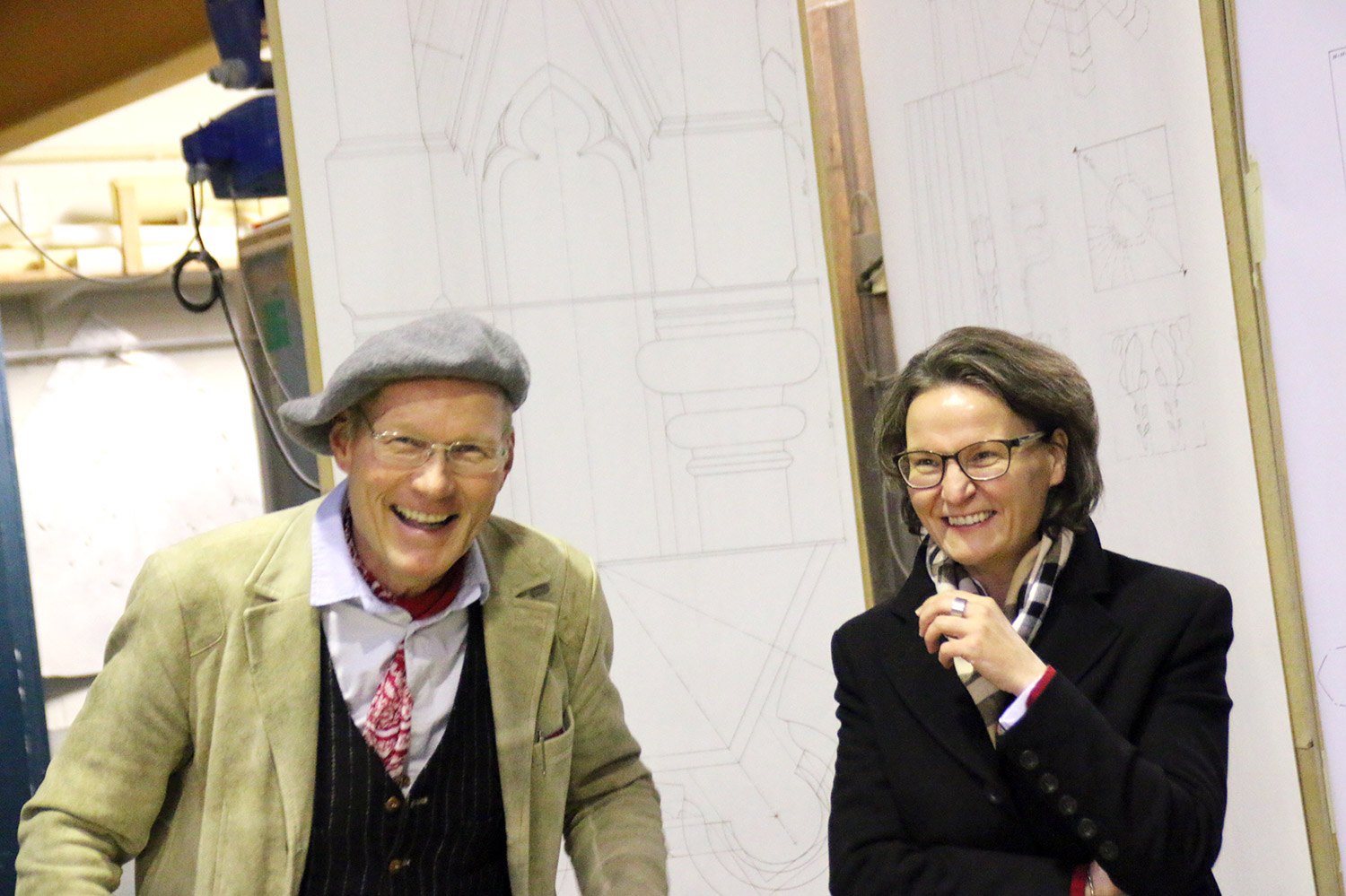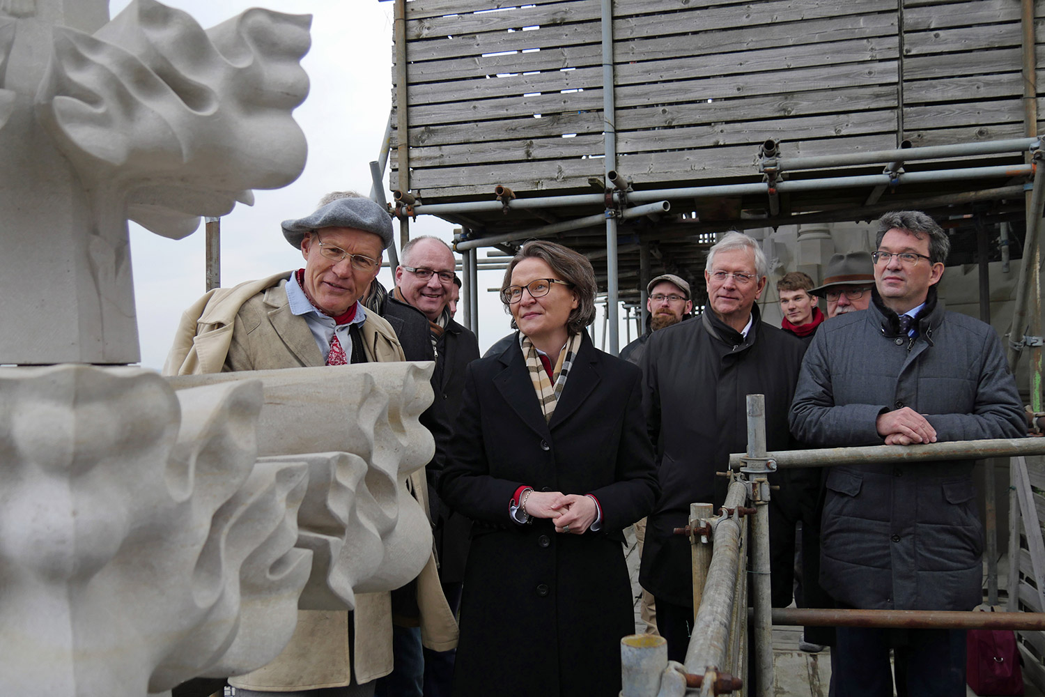 Am Freitag, den 23. März 2018 durften wir unserer Ministerin Ina Scharrenbach die generationsübergreifende Maßnahme an der Wiesenkirche und in allen Aspekten die Arbeit der Dombauhütte vorstellen und erläutern. Rasch konnte wahrgenommen werden, dass Frau Scharrenbach auch in Details fein informiert war. So gestaltete sich im Ablauf der mehr als 2 Stunden aus, dass zu den Gesichtern einer Dombauhütte auch ein übergeordnet Wesentliches gehört, welches die Zusammengehörigkeit aller Werkschaffenden über die Epochen der Jahrhunderte betrifft. Sowas ergibt sich von selbst, oder nicht, und kann dann gegriffen werden. Die Teilnehmer des Besuchskreises genossen die Atmosphäre. Die aufgeführten Bilder geben weitere Informationen, ebenso 2 Zeitungsartikel; der in einem Artikel benutzte Begriff Jugendbauhütte wurde während des Termins nicht verwendet, es war stets die Rede von einer „Kinderbauhütte“. Die Bilder sind von Thomas Brüggestraße und Klaus Fischer.