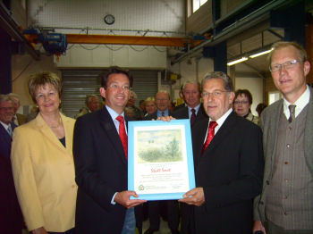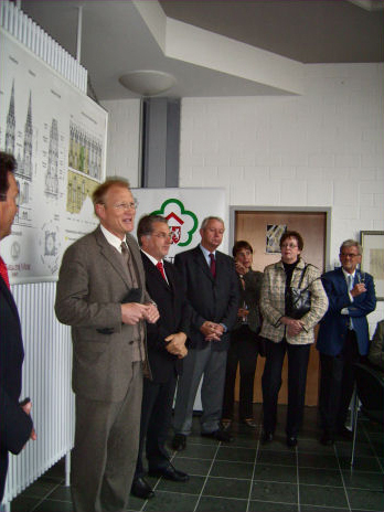Wohlwollender Förderer des Grünsandsteinmuseums war die NRW-Stiftung "Natur-Heimat-Kultur". Am 08. Mai 2008 war sie zu Gast in der Bauhütte. Herzlich willkommen war der Präsident der Stiftung, Staatsminister a.D. Franz-Josef Kniola, sowie die Mitglieder des Stiftungsrates, der Soester Bürgermeister Dr. Eckhard Ruthemeyer und alle erschienenen Vertreter aus dem öffentlichen Leben. Präsident Franz-Josef Kniola erinnerte an den Aufbau der Bauhütte und ihren Werdegang an der Restaurierungsbaustelle St. Maria zur Wiese sowie an die Entstehung der Meisterschule vor 10 Jahren. Die positiven Entwicklungen haben schließlich zur maßgeblichen Förderung des Soester Grünsandstein-Museums durch die Stiftung geführt. Nach der Begrüßung begaben sich die Gäste in die Werkhalle der Bauhütte, wo Stiftungs-Präsident Kniola zwei Urkunden überreichte.