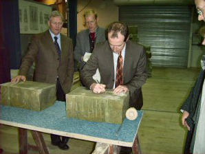 Beim Besuch der Bauhüttenwerkstatt überbrachte Minister Oliver Wittke die Zusage seines Ministeriums, die Landesförderung der Restaurierungsmaßnahmen bis ins Jahr 2022 fortzuschreiben. Im Anschluss daran waren die beiden Minister gern bereit, zwei Steine für das Projekt "Kinderfeldkirche" zu signieren.
