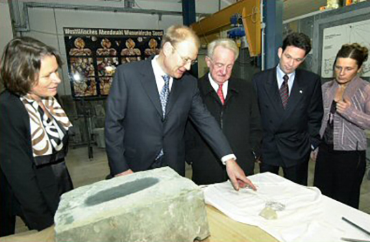 am Stein in der Werkstatt, v.l.n.r.: Christina Rau, Jürgen Prigl, Johannes Rau, E. Ruthemeyer mit Gattin; der weiße Steinhauerschurz trägt inzwischen viele Unterschriften, als erster zeichnete ihn Johannes Rau, damals als NRW-Ministerpräsident, bei der Eröffnung der Dombauhütte 1994.