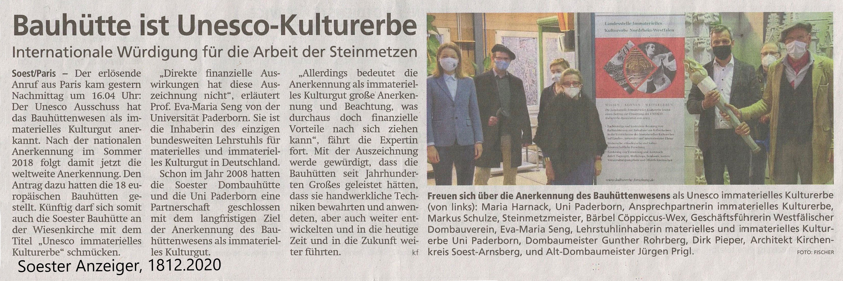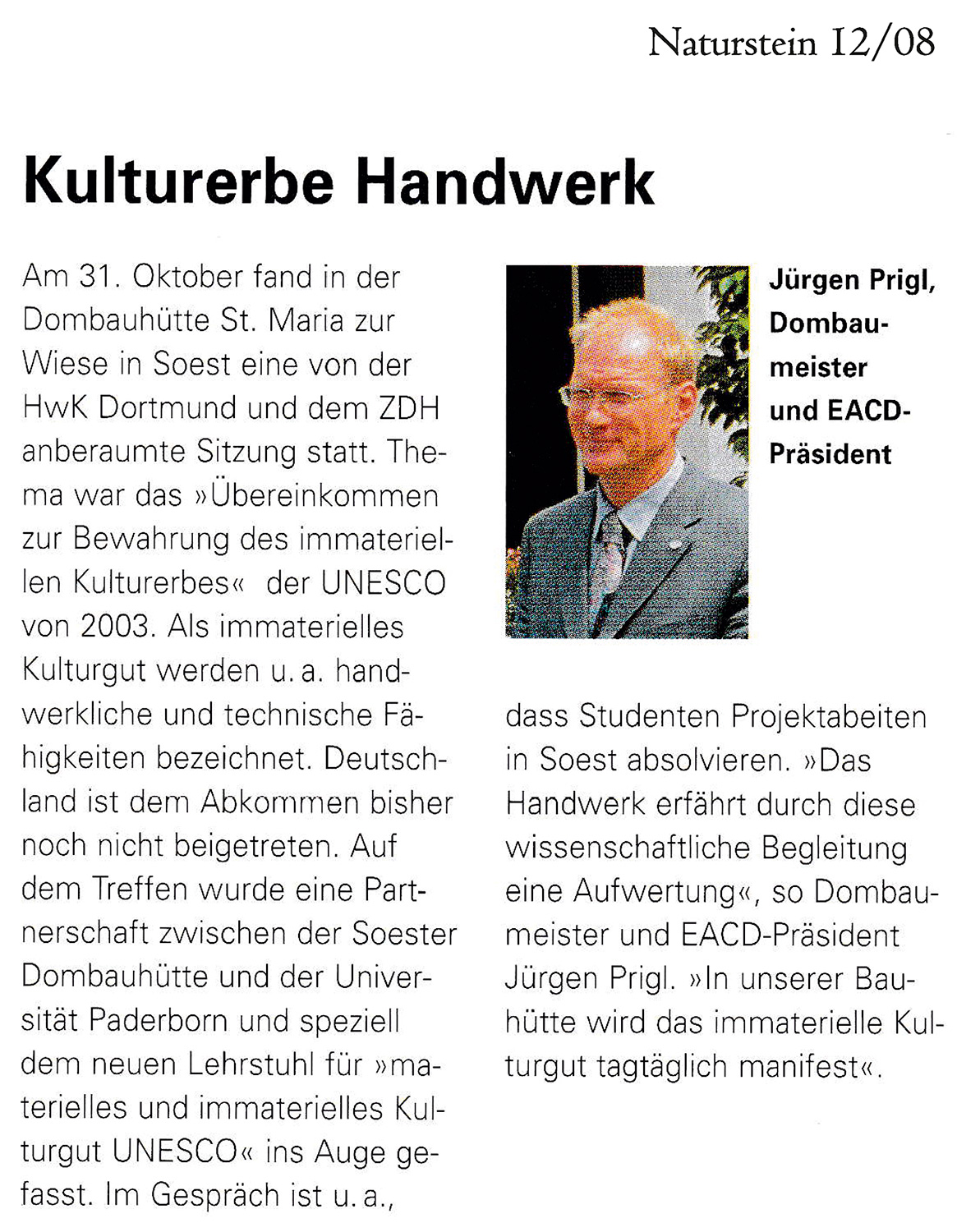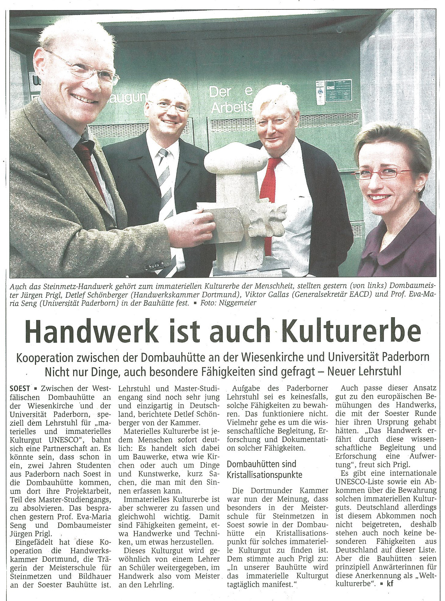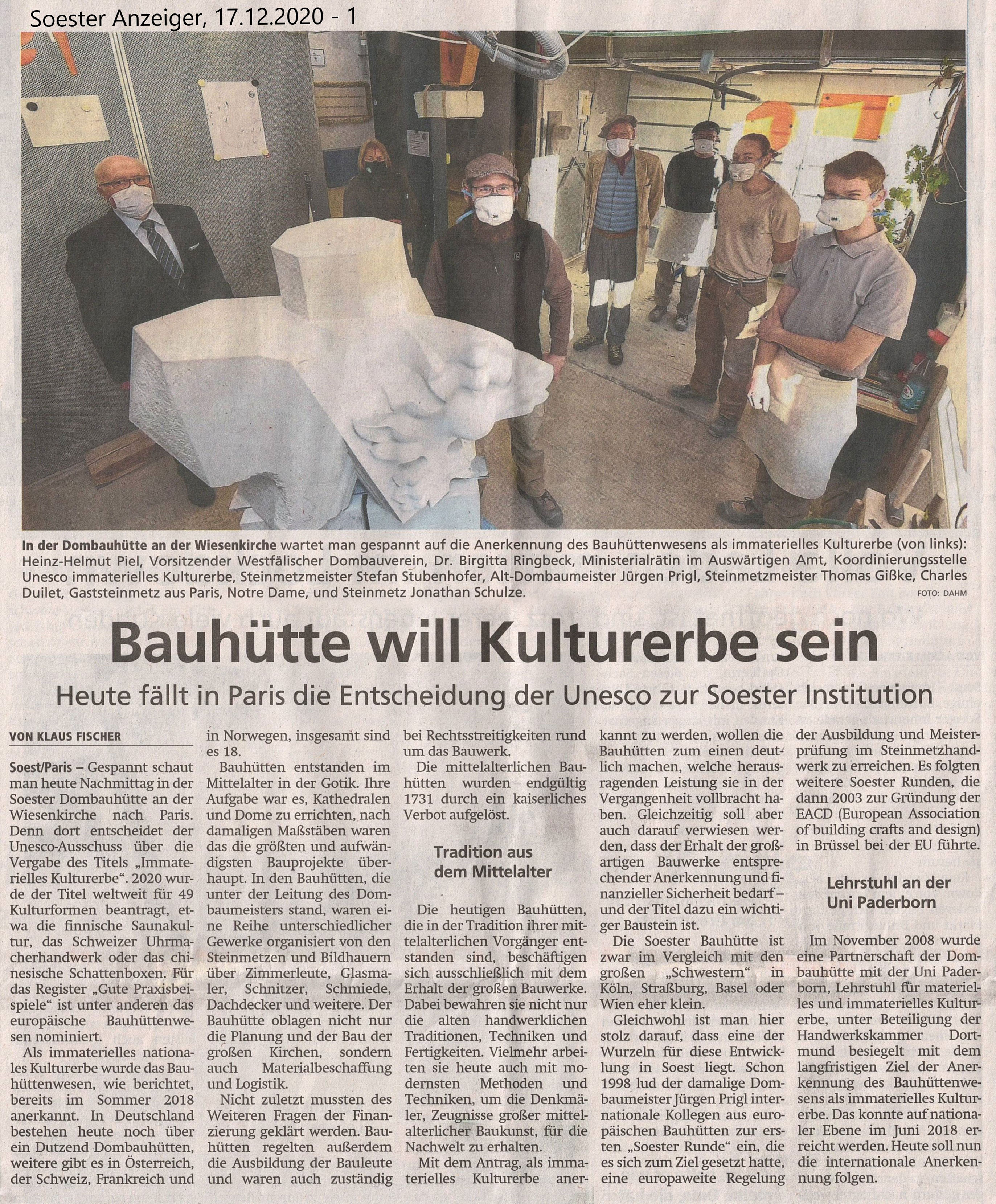 Die Bundesrepublik Deutschland war dem Abkommen zum Immateriellen Kulturerbe erst im Jahre 2013 beigetreten, Österreich 2009, die Schweiz 2008. Schon im selben Jahr fanden ambitioniert die ersten Aktivitäten dazu ambitioniert statt, wie die nebenstehenden Pressedokumente künden. Die Stellungnahme unseres Dombaumeisters ist von 2019.