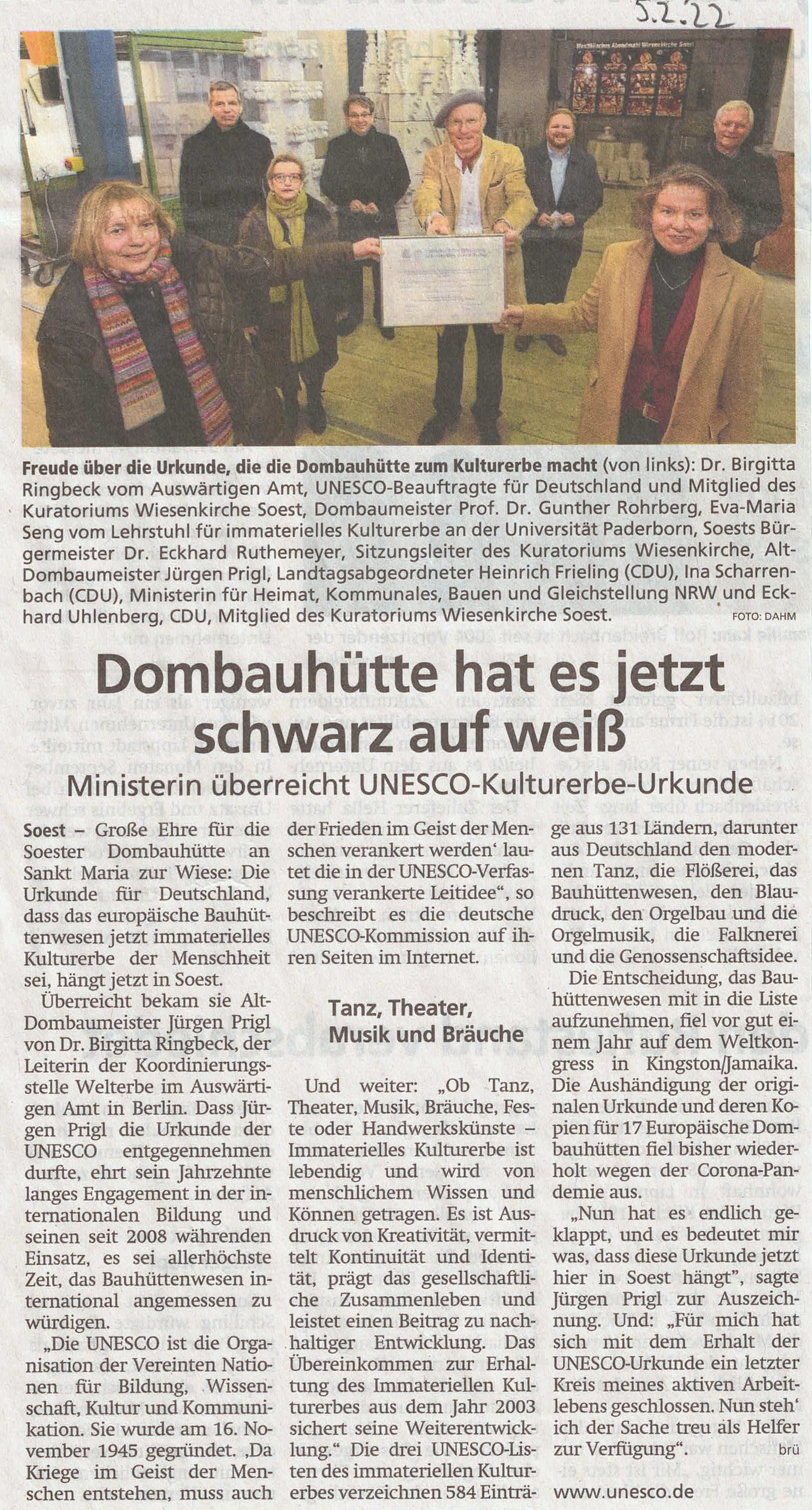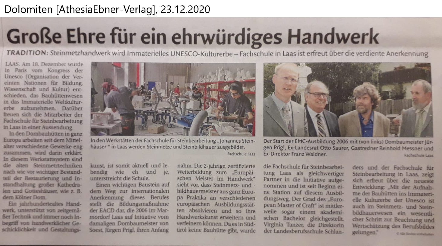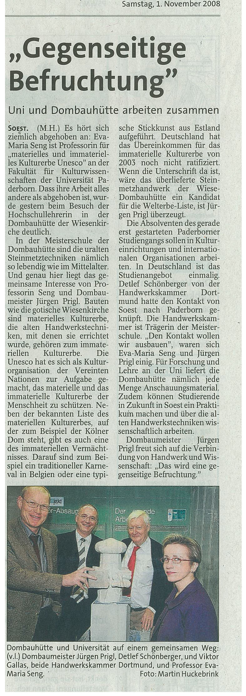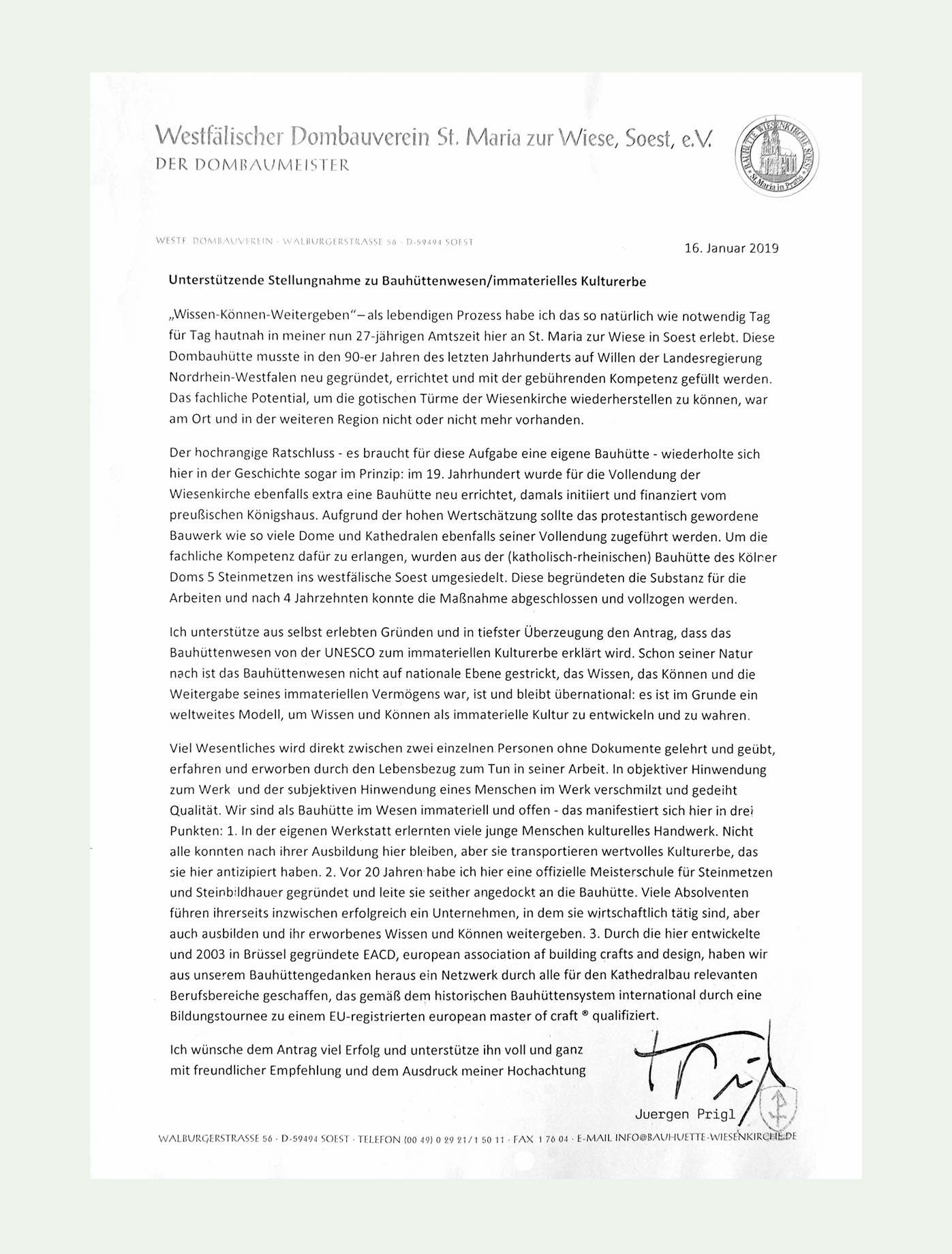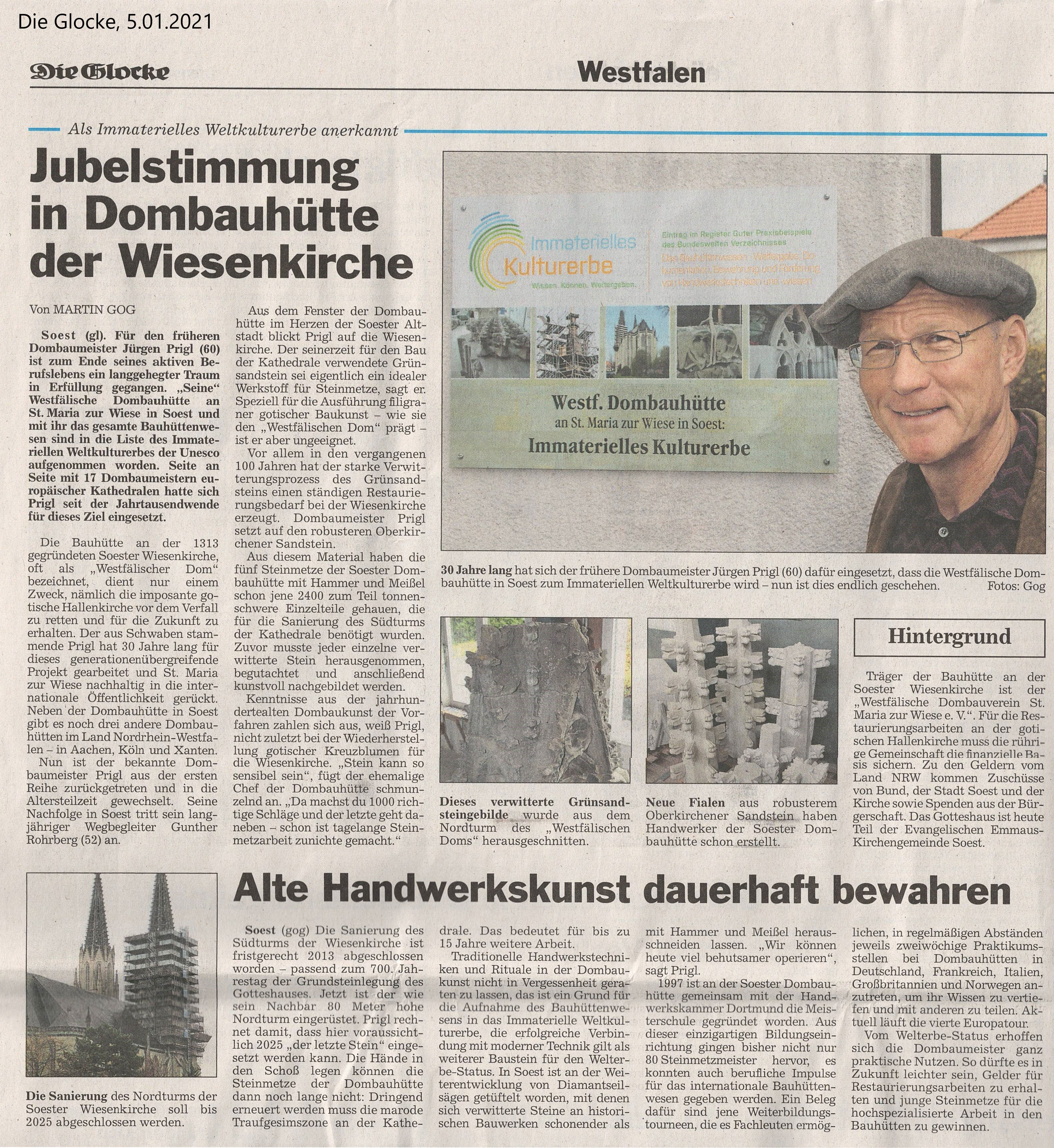 Die Bundesrepublik Deutschland war dem Abkommen zum Immateriellen Kulturerbe erst im Jahre 2013 beigetreten, Österreich 2009, die Schweiz 2008. Schon im selben Jahr fanden ambitioniert die ersten Aktivitäten dazu ambitioniert statt, wie die nebenstehenden Pressedokumente künden. Die Stellungnahme unseres Dombaumeisters ist von 2019.