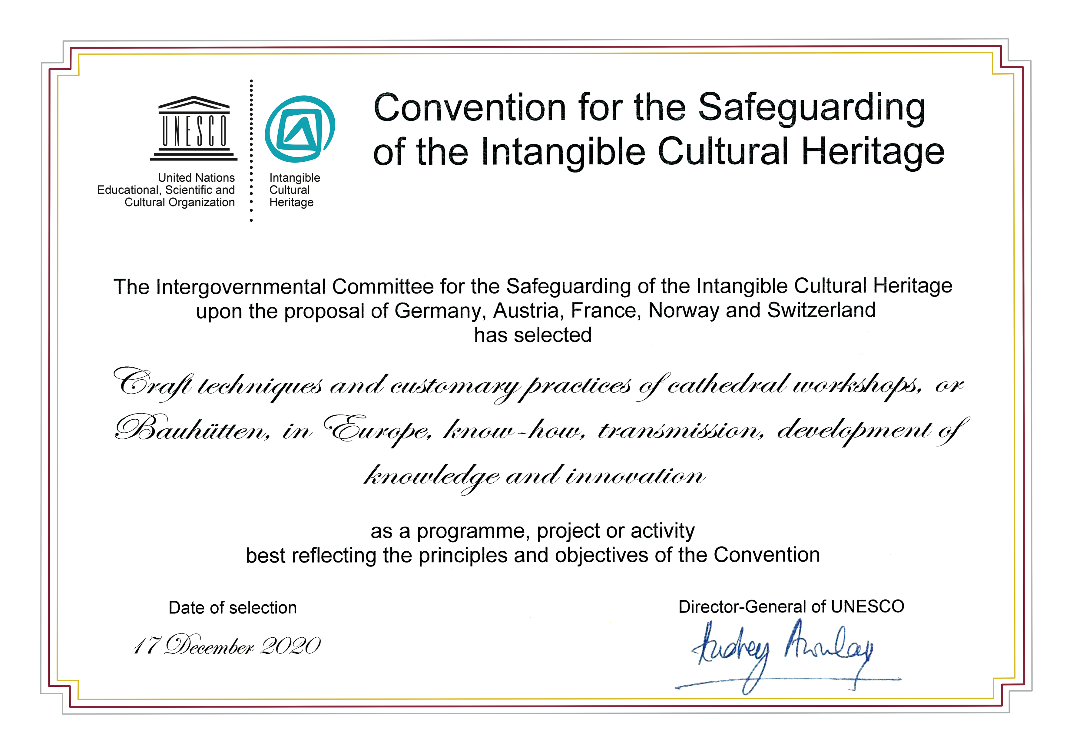Am Donnerstag, dem 17. Dezember kurz nach 16 Uhr war es soweit: Der zwischenstaatliche Ausschuss der UNESCO beschloss, das Bauhüttenwesen in sein „Register der guten Praxisbeispiele zur Erhaltung des Immateriellen Kulturerbes“ aufzunehmen.