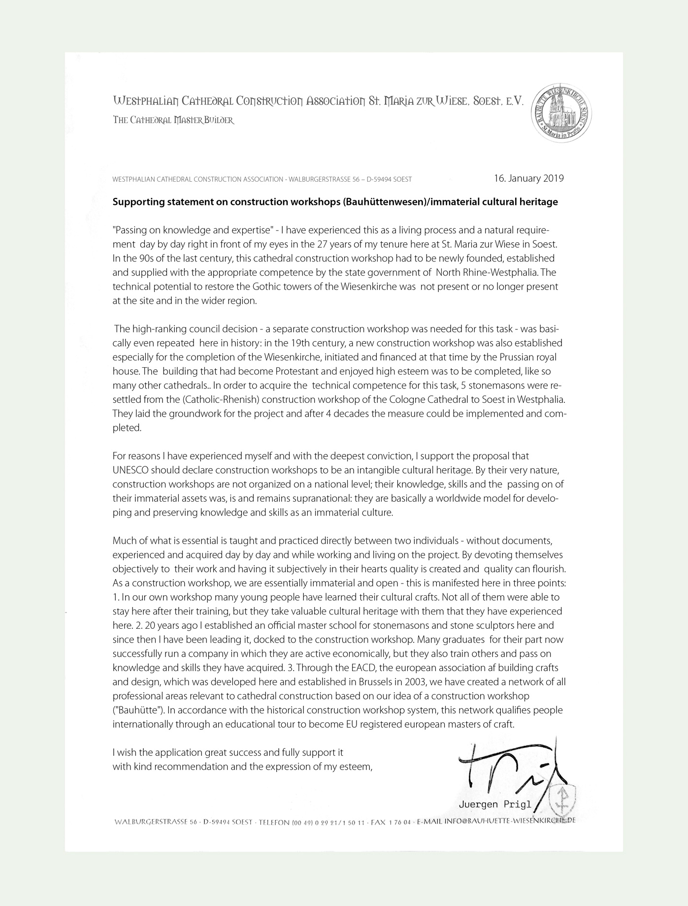 The Federal Republic of Germany did not accede to the Agreement on Intangible Cultural Heritage until 2013, Austria in 2009 and Switzerland in 2008. In the same year, the first ambitious activities took place already, as documented by the accompanying press announcements. Our cathedral master builder's statement is from 2019.